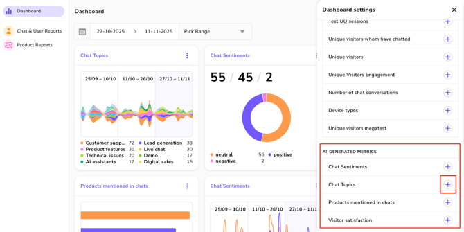 - Choose Metrics: A list of available metric cards will appear. Select the AI Chat Labeling metric(s) you just created and click the plus icon.