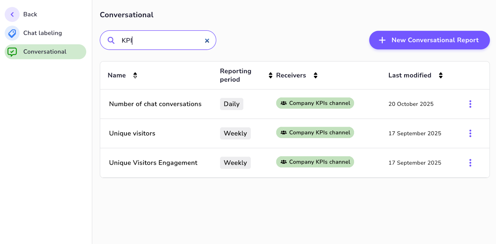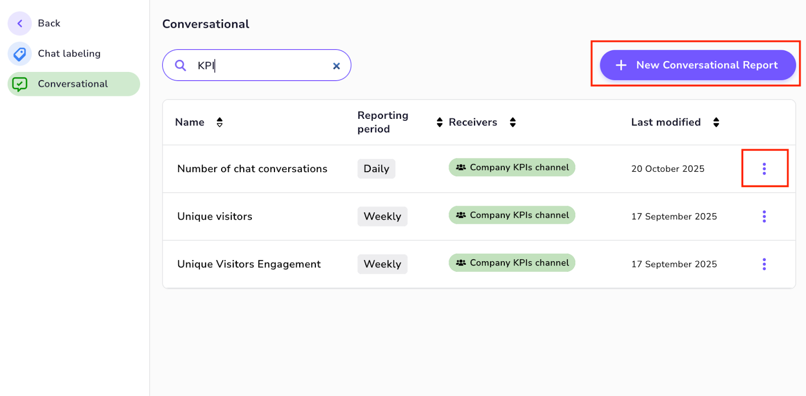 You can start creating a new report by clicking "New Conversational Report". Existing reports are opened and edited by clicking the three dots on the report listing line.