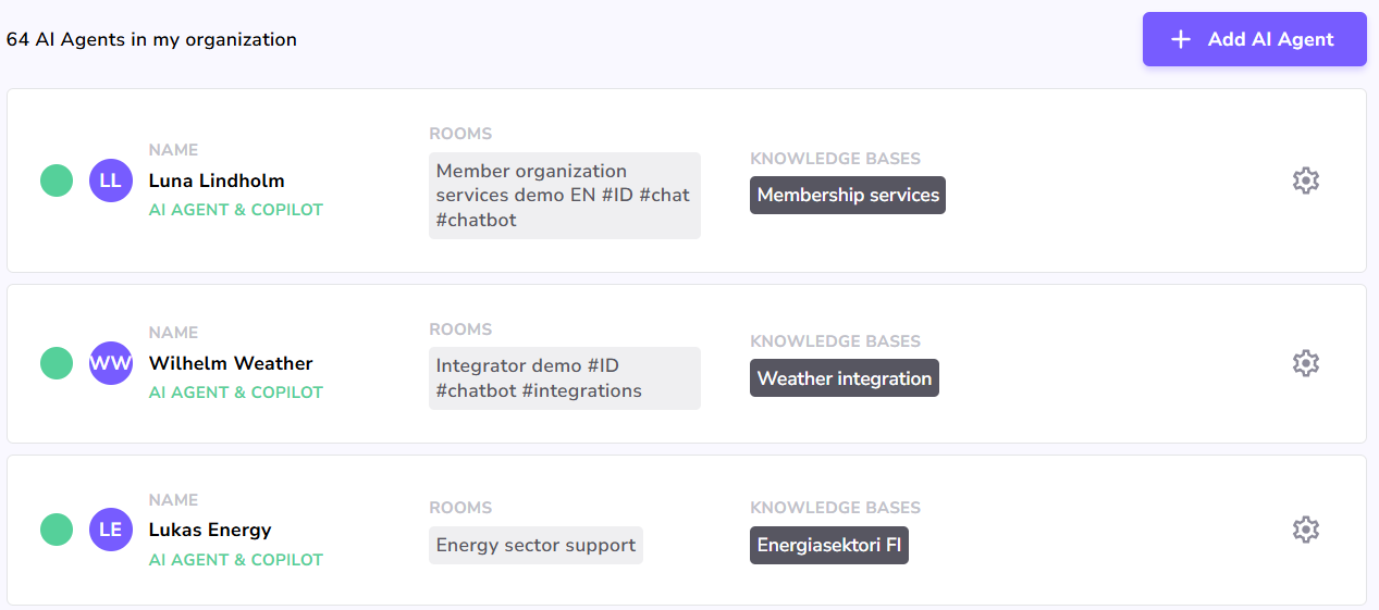 From the AI Agents UI choose the correct Agent and open it's Settings from the cogwheel icon.