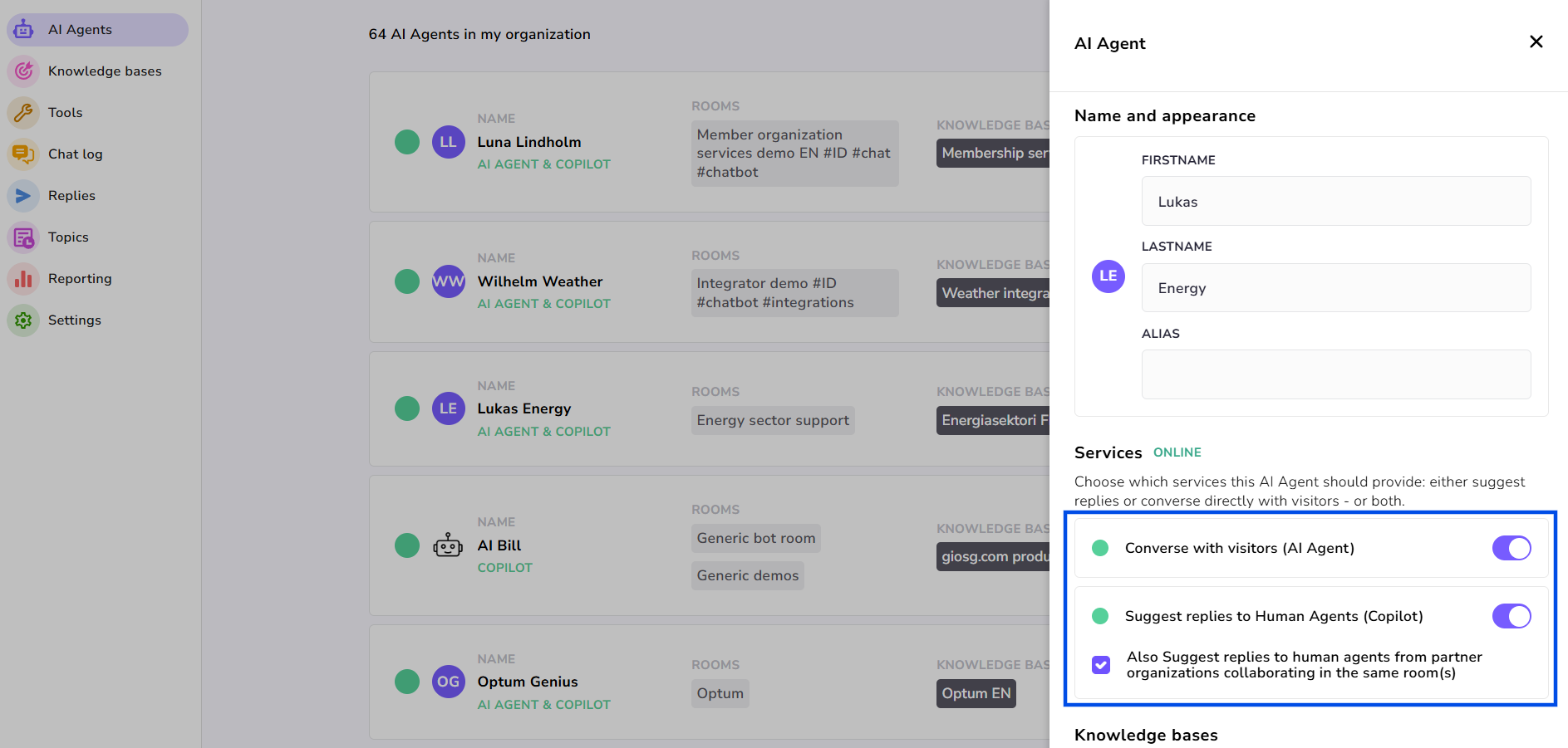 In the Services section, choose what type of services your AI Agent will provide. Will it chat directly with visitors (Chatbot mode) or will it suggest replies to your Human Agents (Copilot mode)? The same AI Agent can of course also do both.